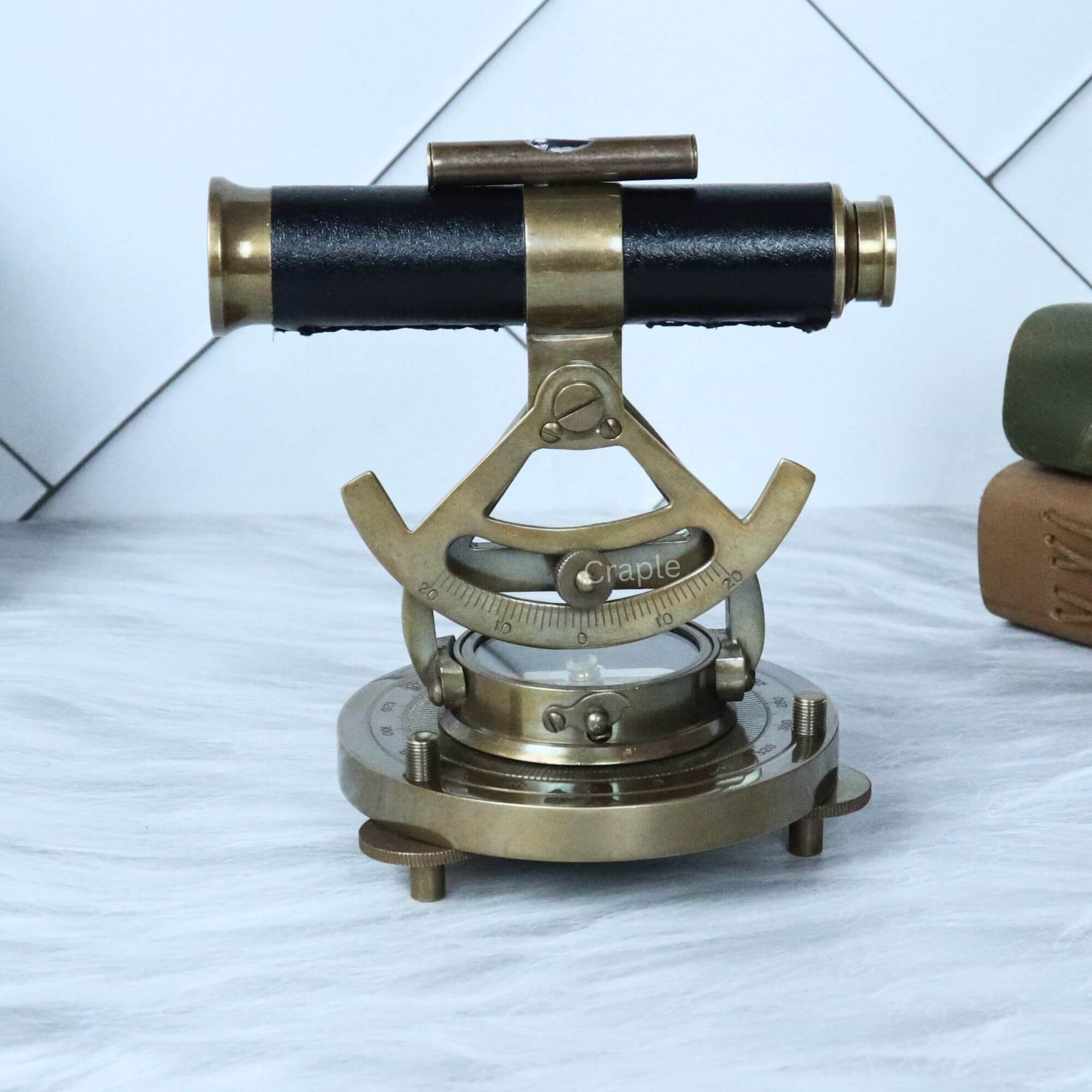 A functional tribute to classic surveying instruments. This handcrafted brass alidade features a tilting telescope, inclinometer, spirit level, and a lockable compass on a fully adjustable base. It is the perfect high-quality gift for engineers, surveyors, and collectors of scientific instruments.