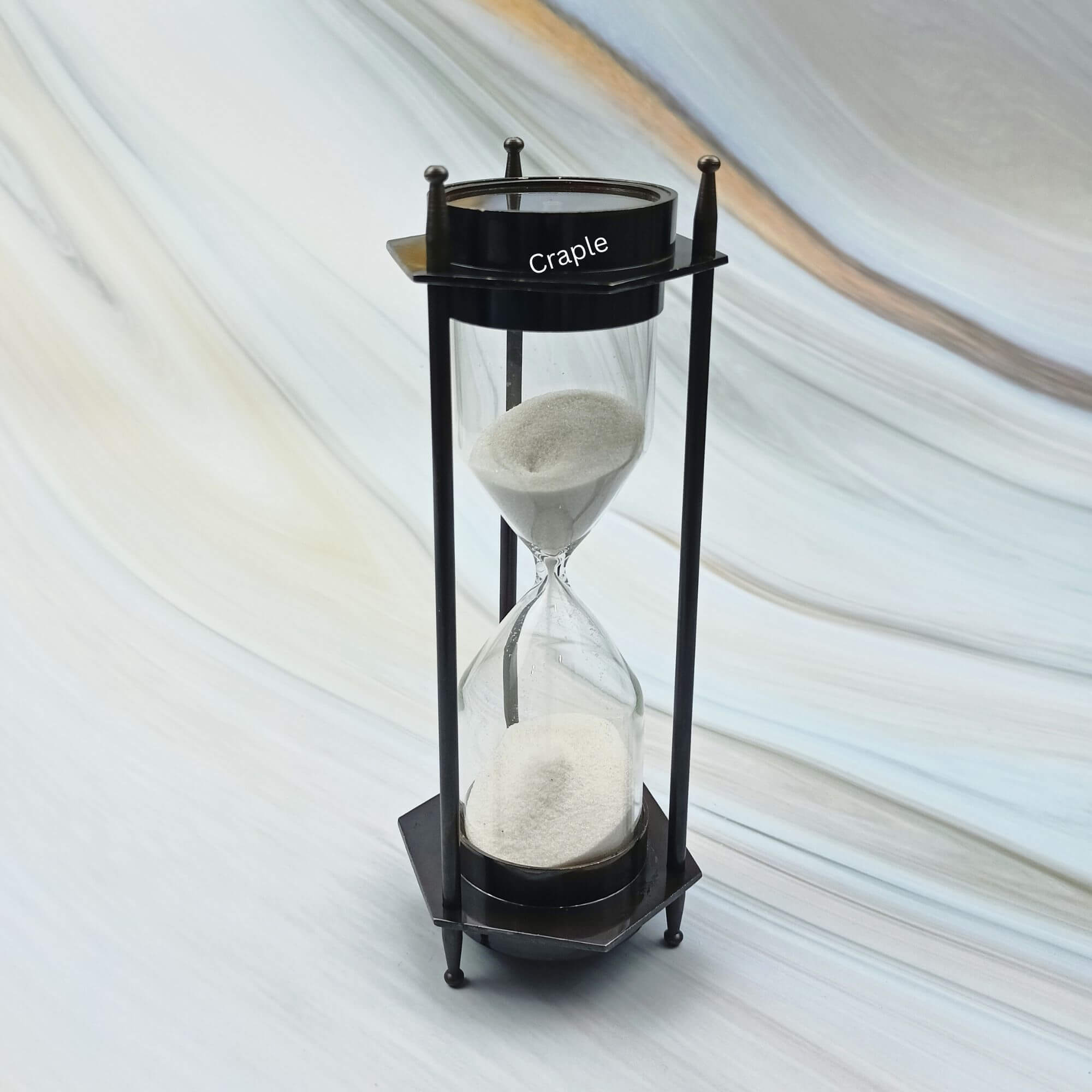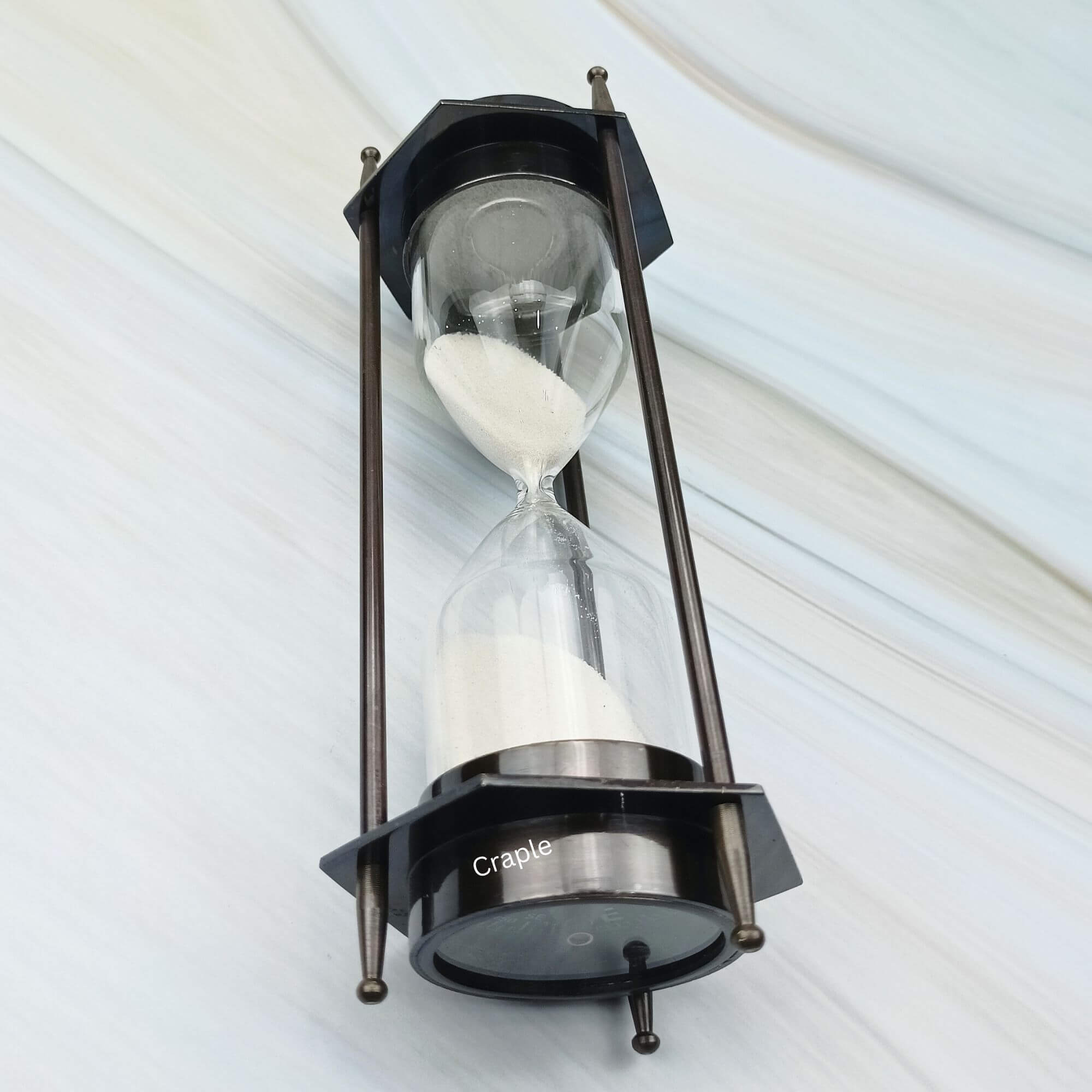This isn’t your ordinary sand timer. Crafted with unique hexagonal end plates in a black antique brass finish, it features functional compasses top and bottom, framing a classic 3-minute hourglass for a truly distinctive look.