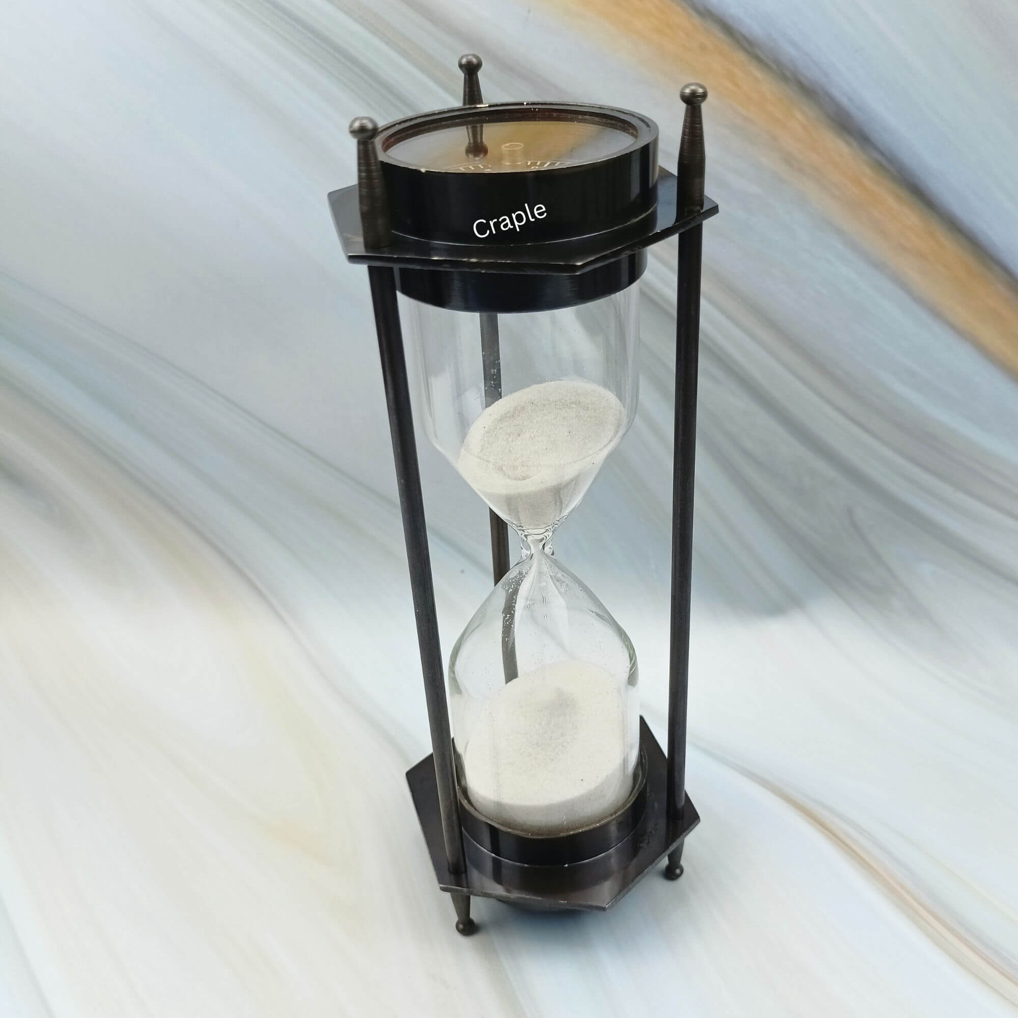 This hexagonal hourglass, featuring dual compasses and finished in black antique brass, measures approximately 3 minutes with white sand, a unique blend of vintage aesthetics and functional curiosity.