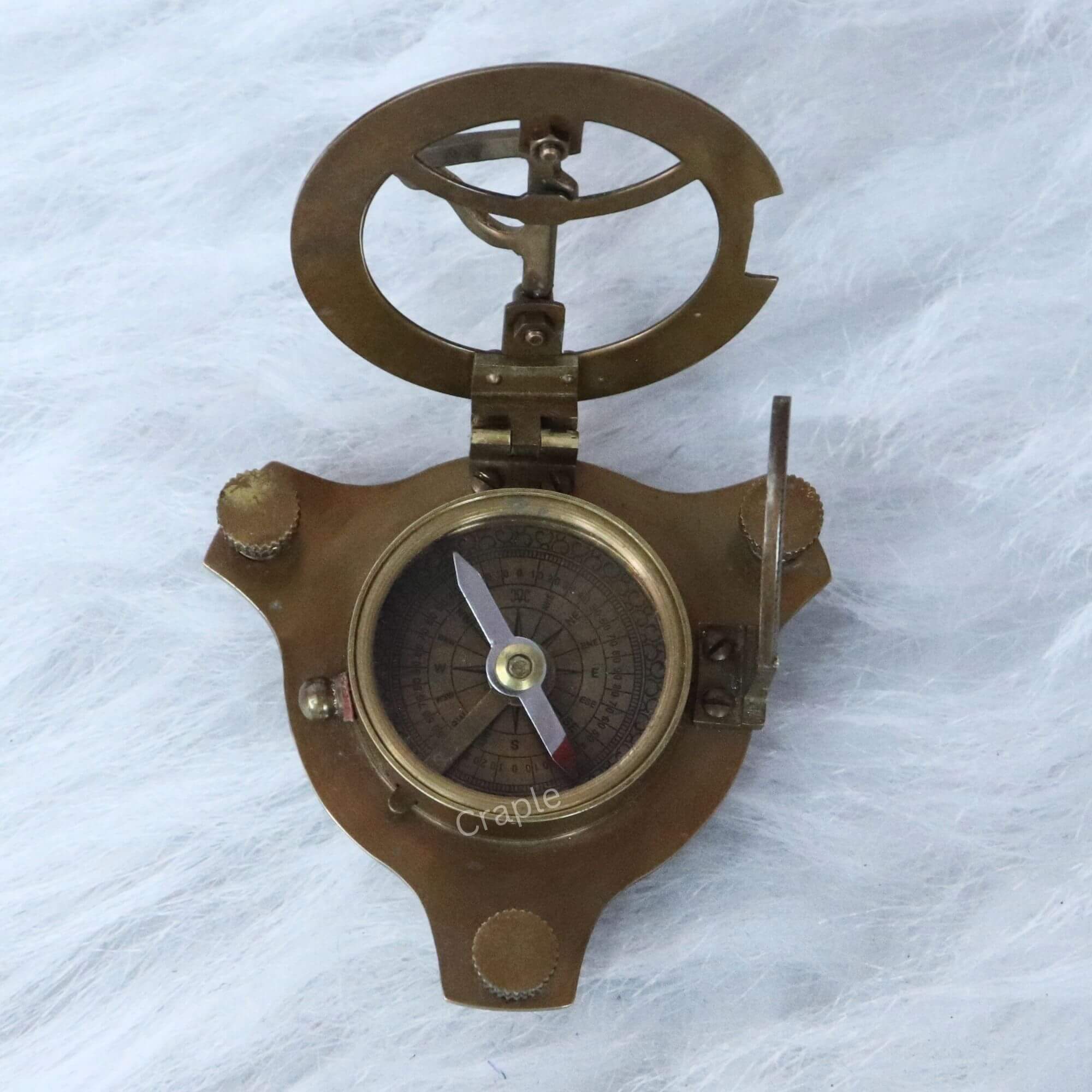 This exquisite antique brass sundial compass features an adjustable height compass, a needle stop mechanism, and presented in an engravable wooden box, it’s a remarkable piece for any enthusiast or collector.