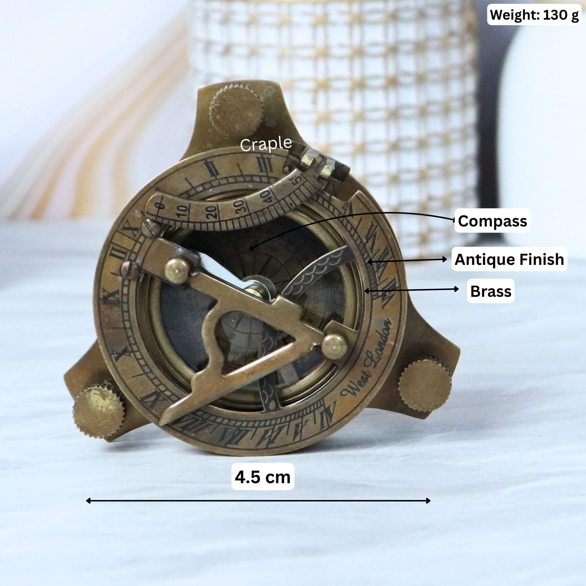 Journey back in time with this beautifully crafted “West London” style sundial compass. Its solid antique brass construction, combined with clever adjustable features and a handsome wooden presentation box, makes it a truly special and functional piece of art.
