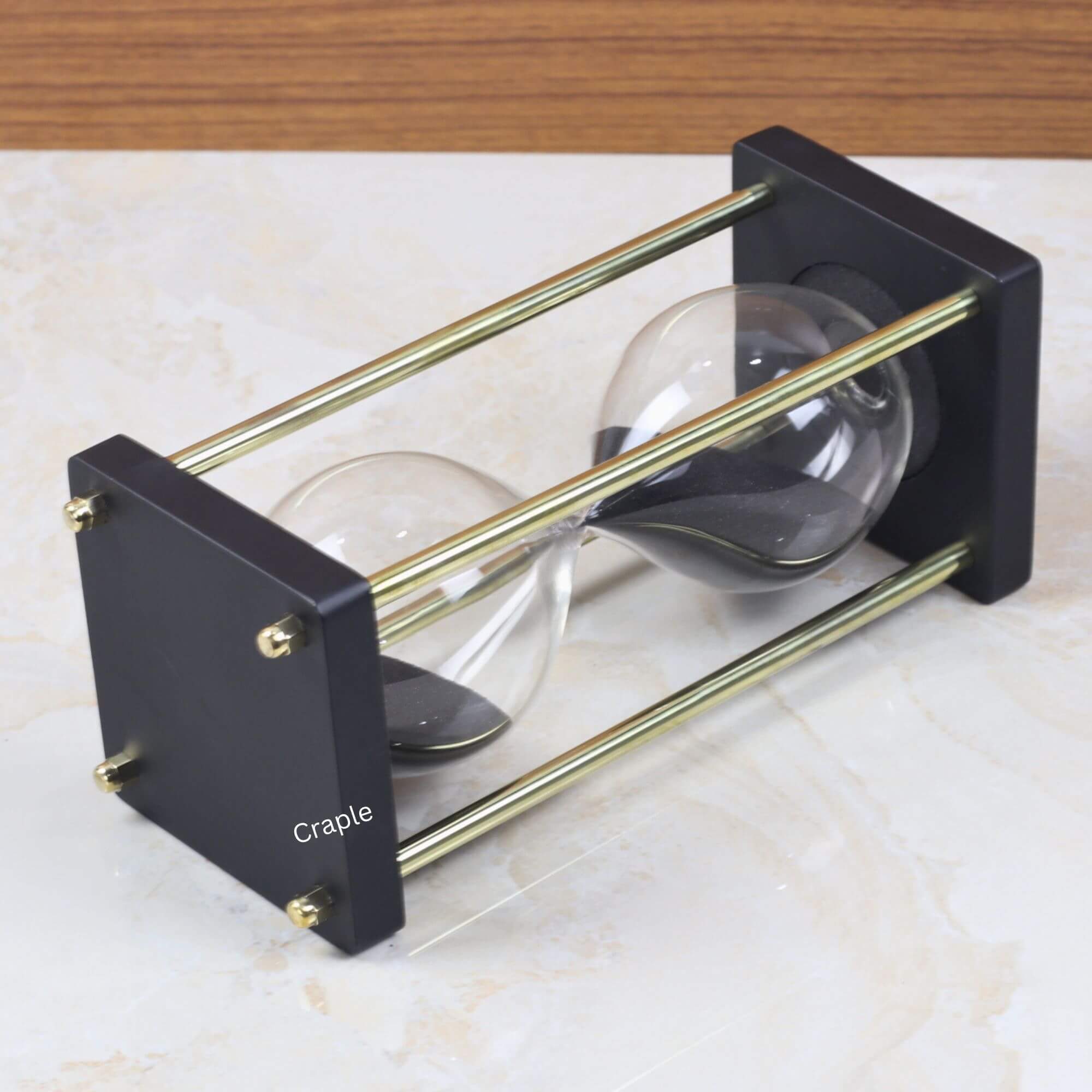 This impressive hourglass merges contemporary design with functional timekeeping. Crafted with sleek black wood bases and gleaming nickel-finished brass pillars, it provides a visually striking way to measure approximately fifteen minutes.