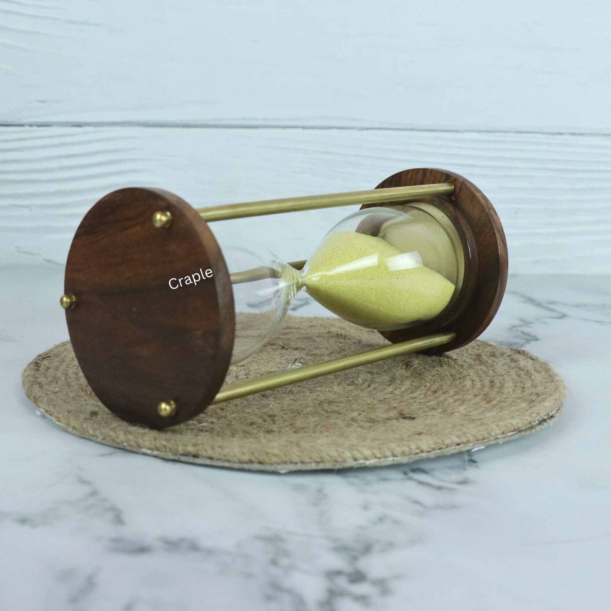 Experience the classic combination of natural wood and polished brass in this elegant hourglass. Designed to measure approximately three minutes, its cheerful yellow sand adds a bright touch, making it both practical and decorative.