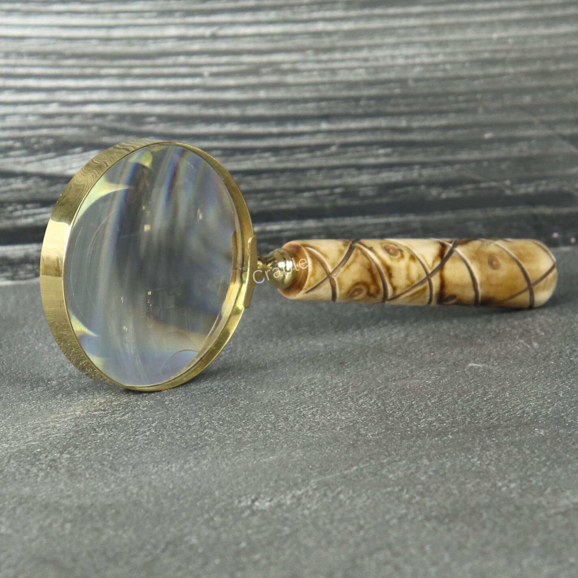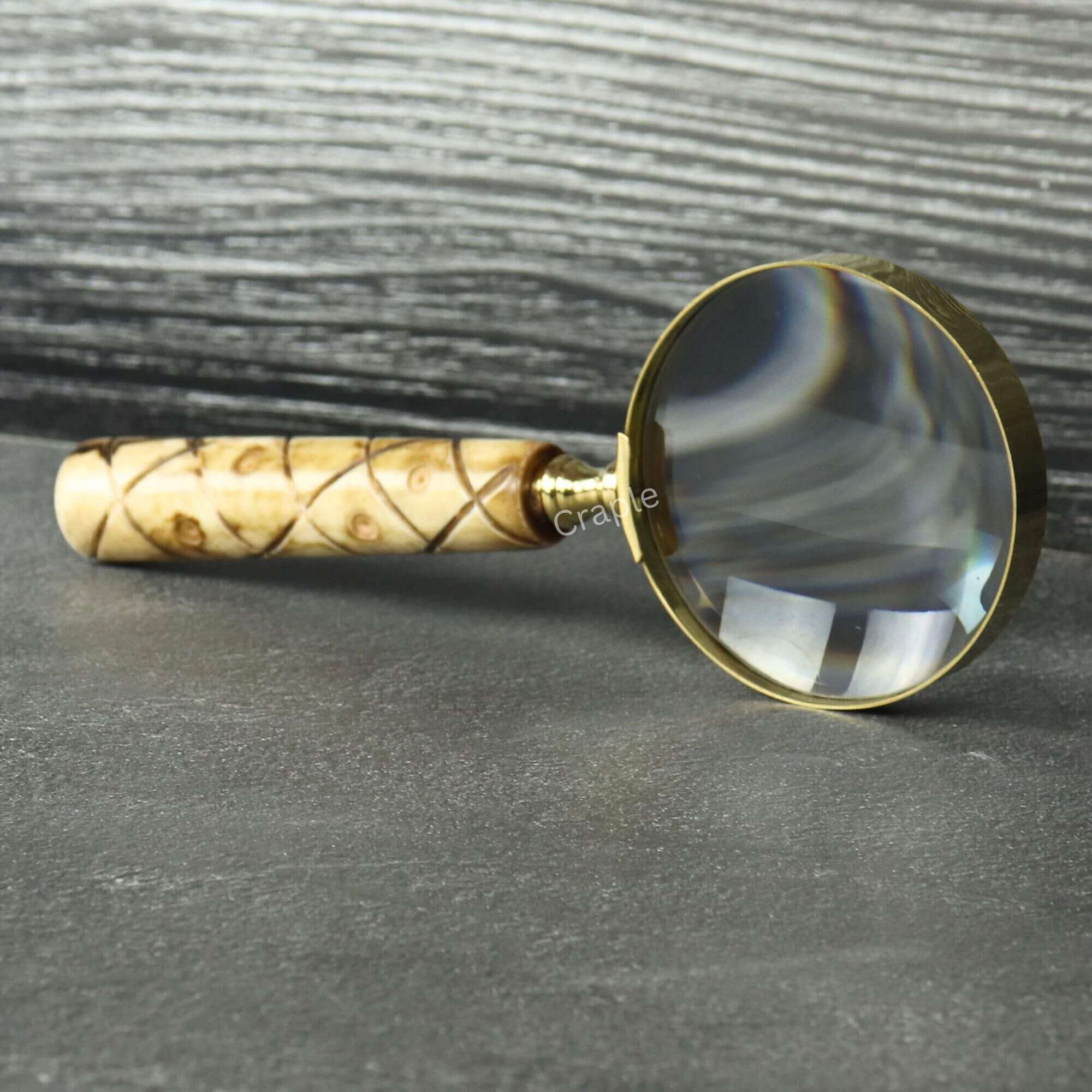This handcrafted magnifier combines timeless design with unique detailing. The polished brass frame surrounds a clear lens, while the patterned handle provides a comfortable grip and visual interest.
