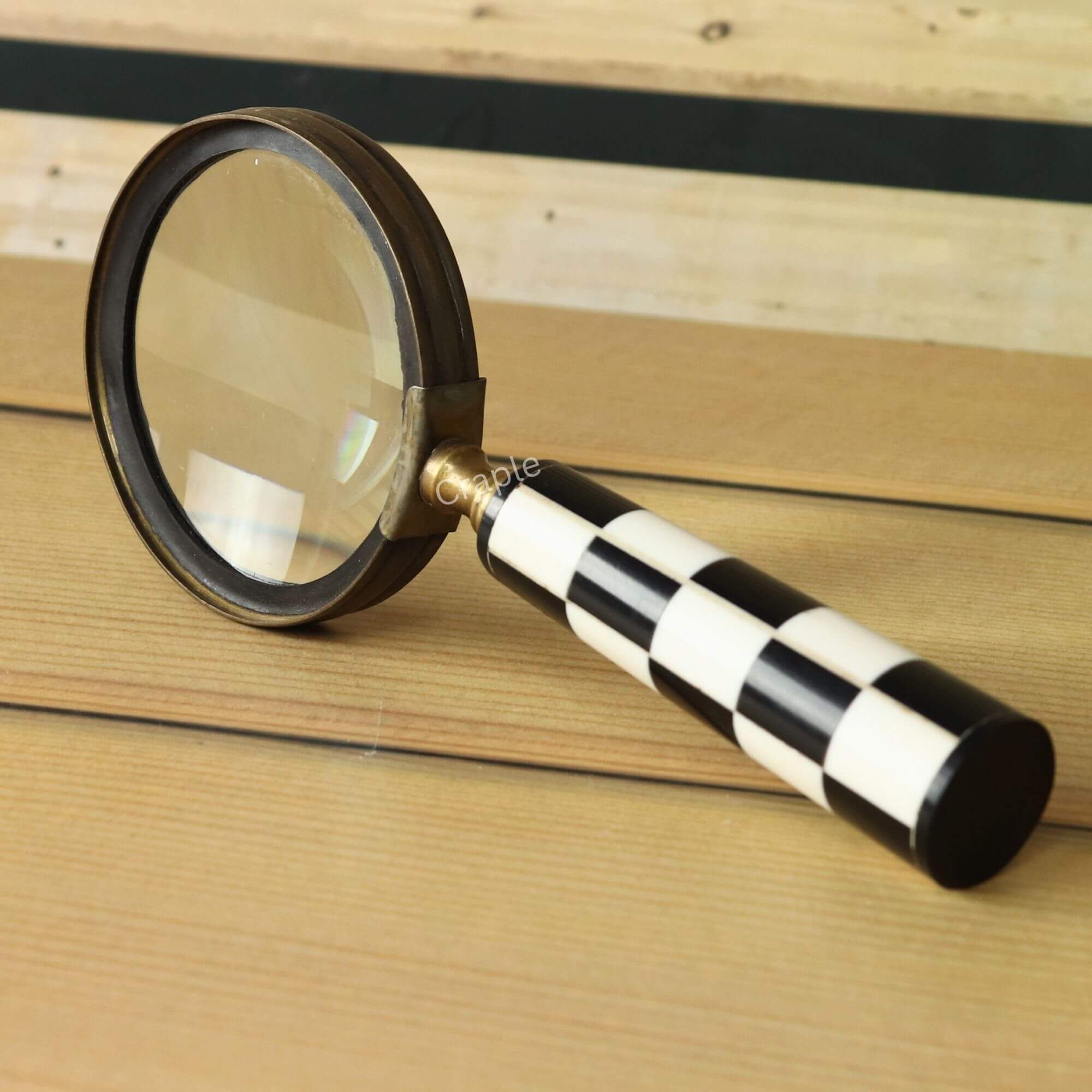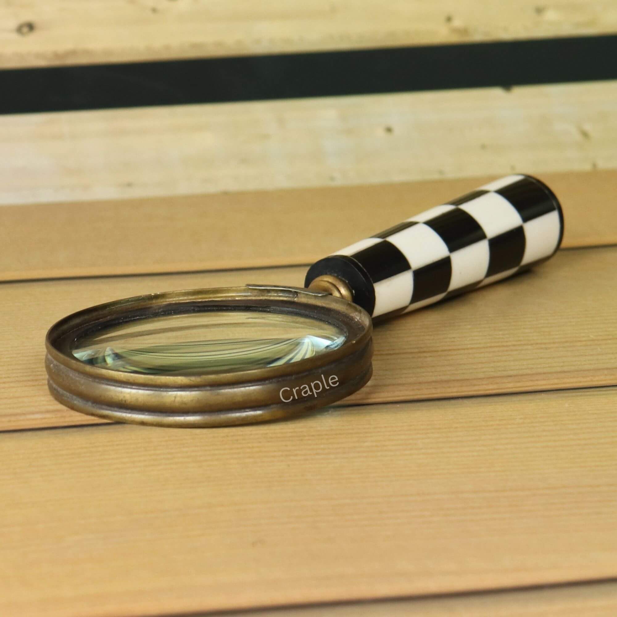 Combine vintage charm with playful design using this handcrafted magnifying glass. The antique brass frame holds a clear lens, while the eye-catching chess pattern handle makes it a standout functional accessory.