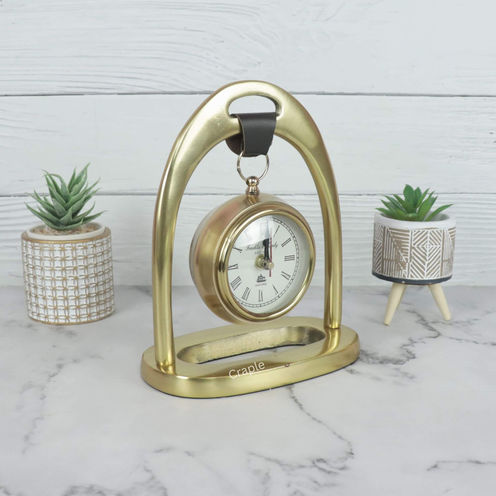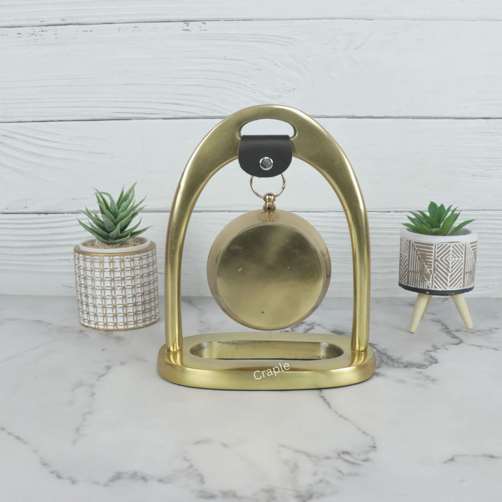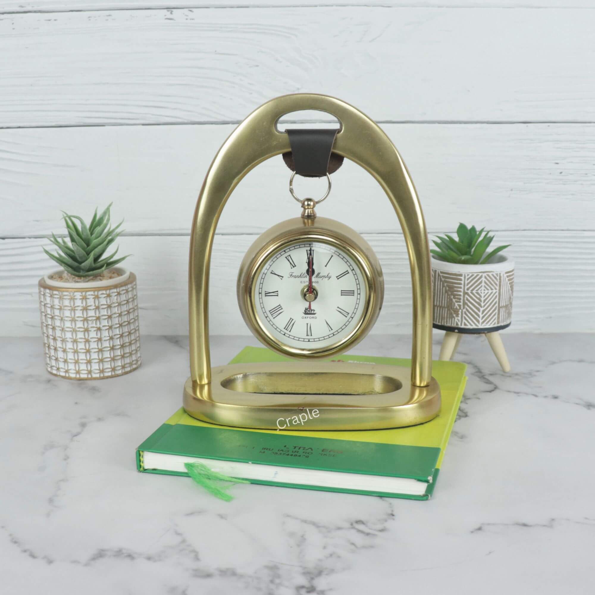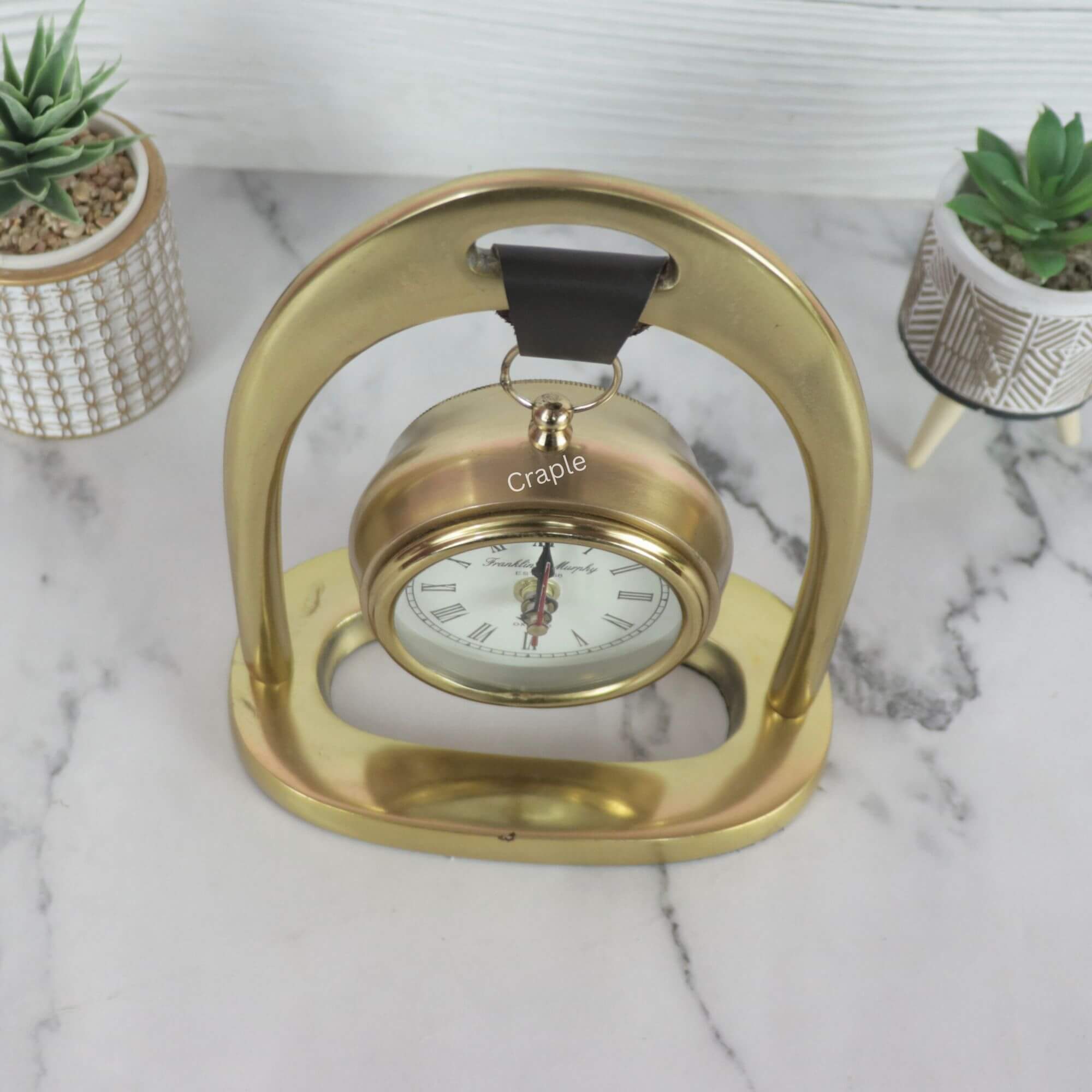 Hanging Golden Aluminium Desk Clock | Arch Frame, Leather Strap | Handcrafted Modern Decor & Gift