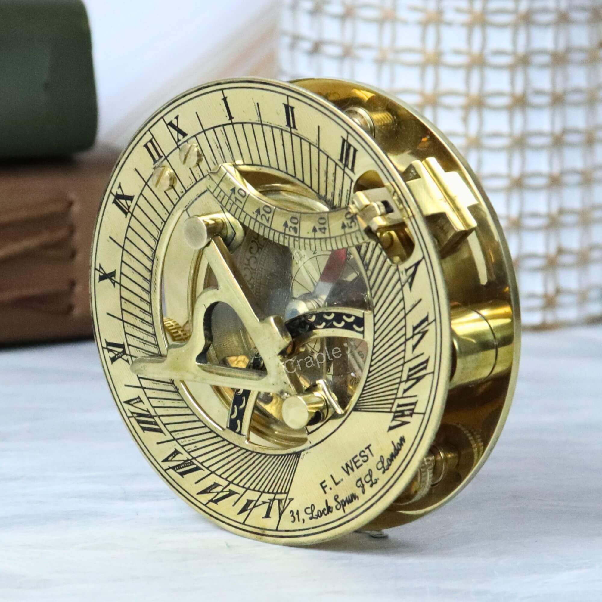 This stunning sundial compass, crafted from highly polished brass, gleams with timeless elegance. Its intricate “F.L. West London” inspired details and functional precision aids make it a remarkable blend of scientific history and decorative art, perfect for any discerning collector or enthusiast.