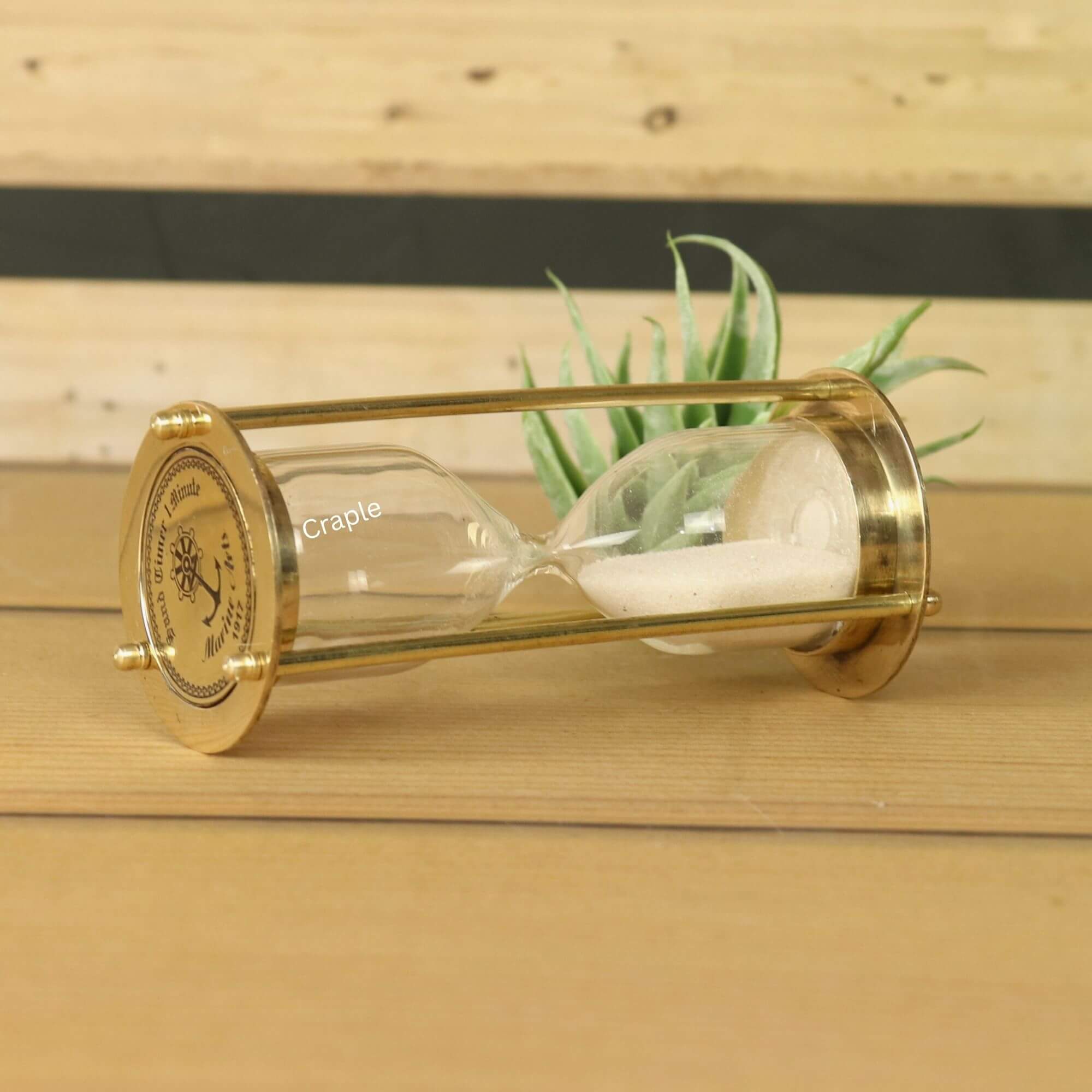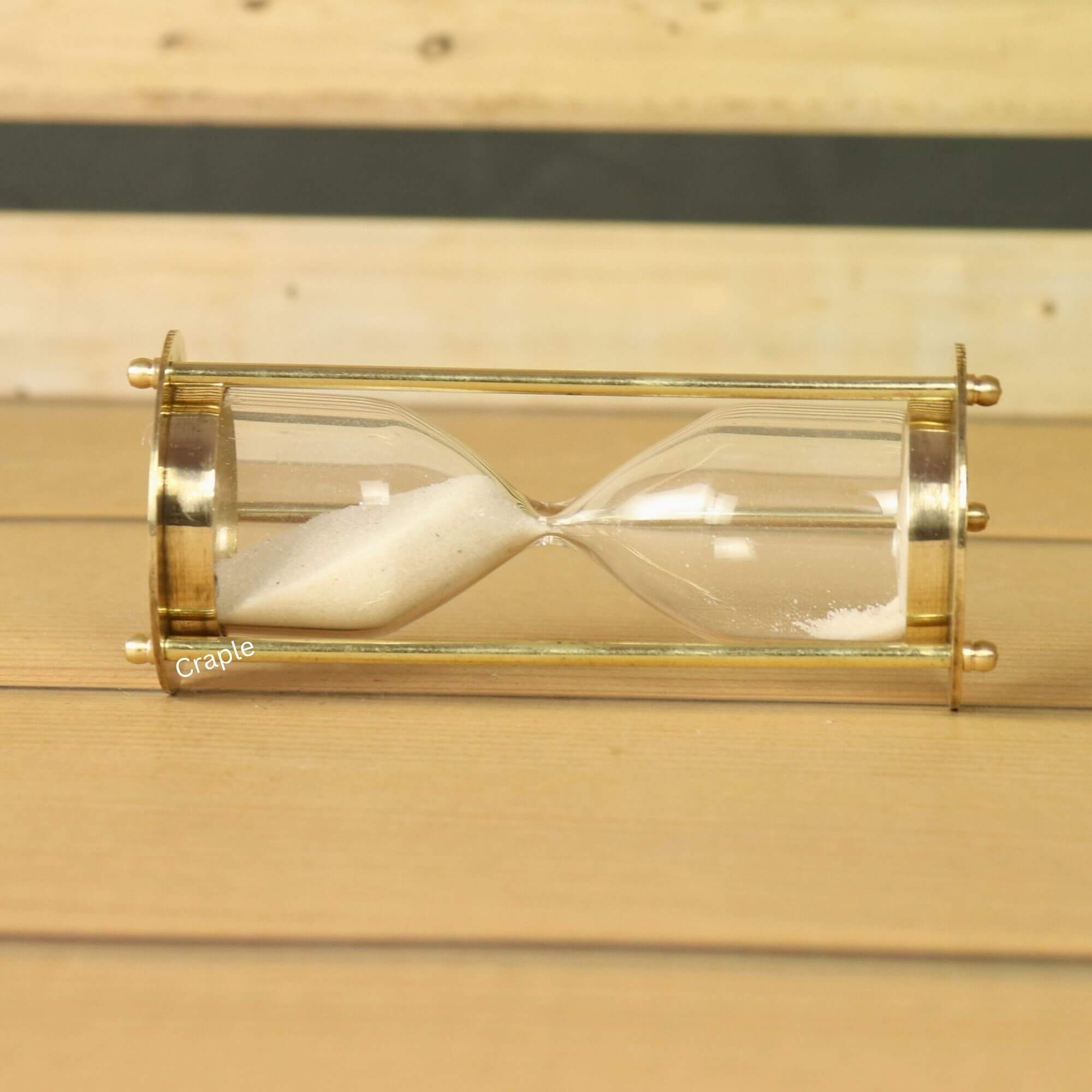 Experience timeless elegance in miniature with this handcrafted shiny brass sand timer. Perfectly pocket-sized, its classic design and one-minute flow of white sand make it a charming desk companion or a unique small gift.
