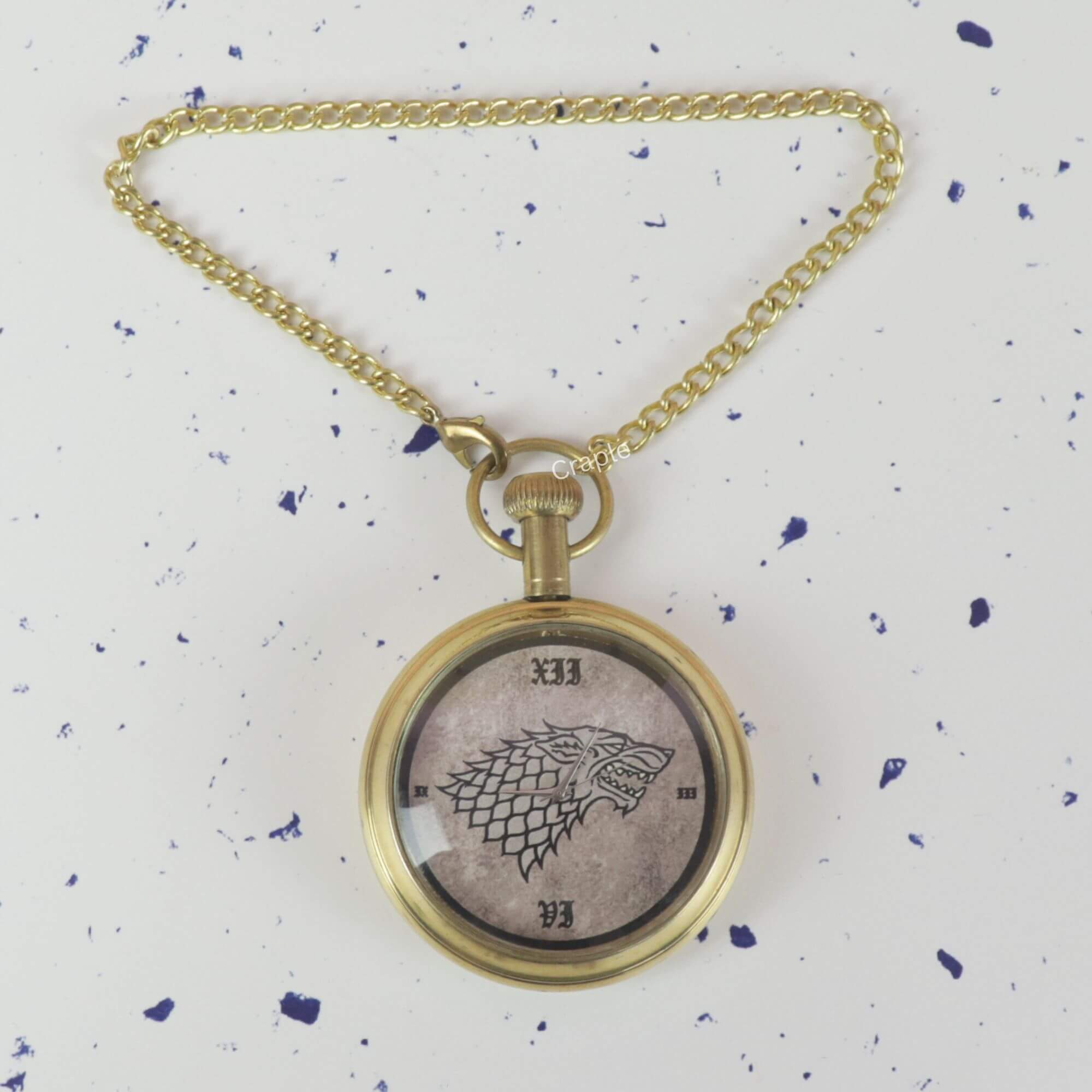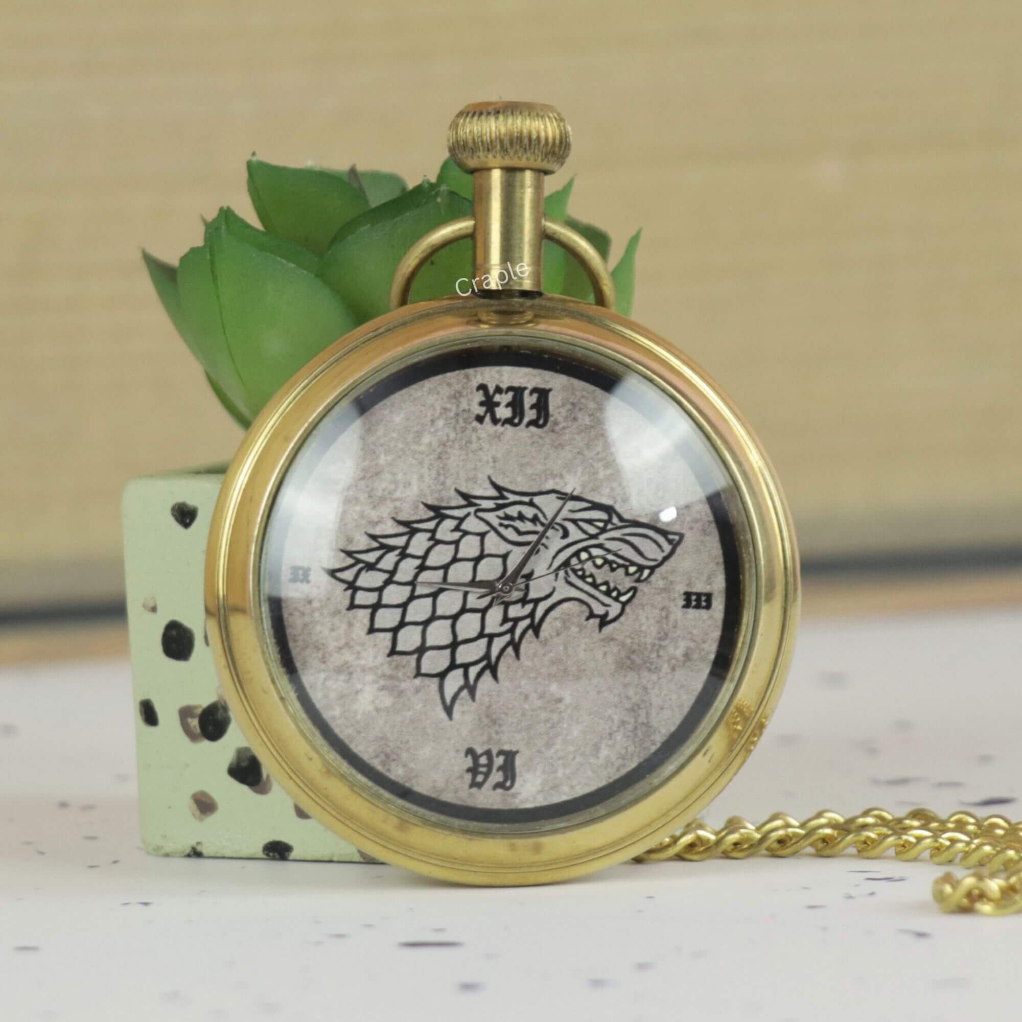 Pledge your allegiance with this handcrafted shiny brass pocket watch, inspired by Game of Thrones. Featuring the iconic Direwolf sigil and a reliable Miyota movement, this gleaming timepiece comes with a chain, making it a perfect accessory for fans of the epic saga.