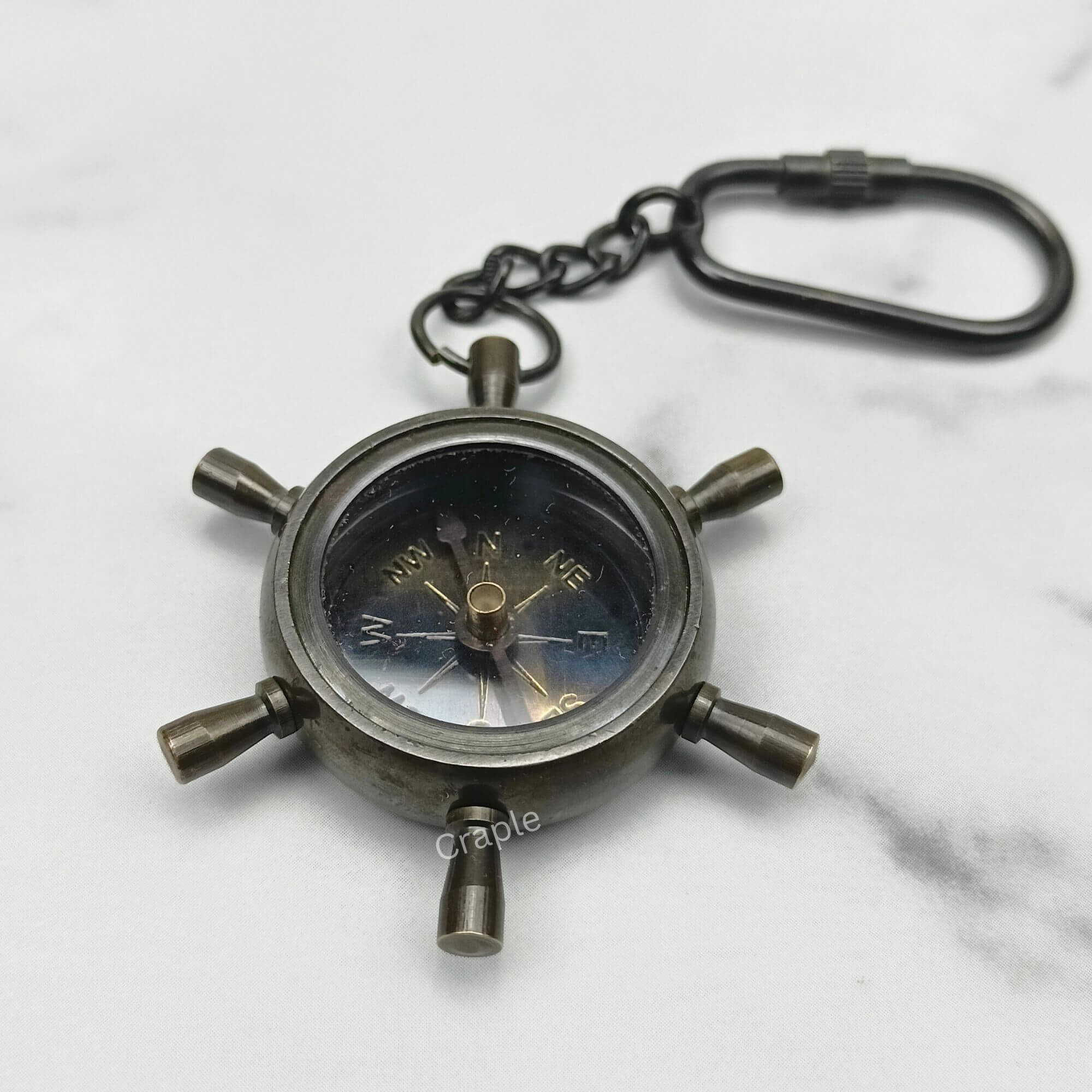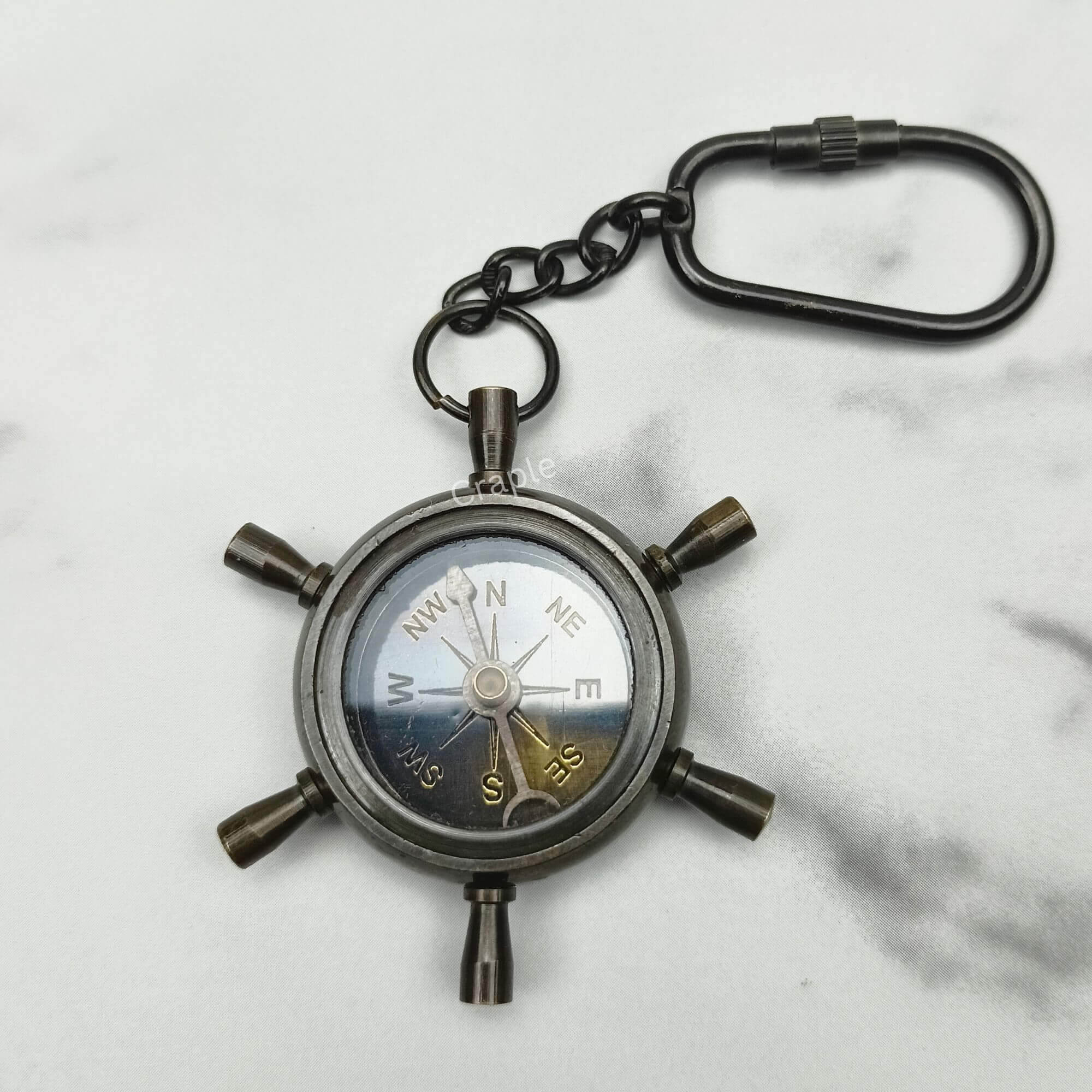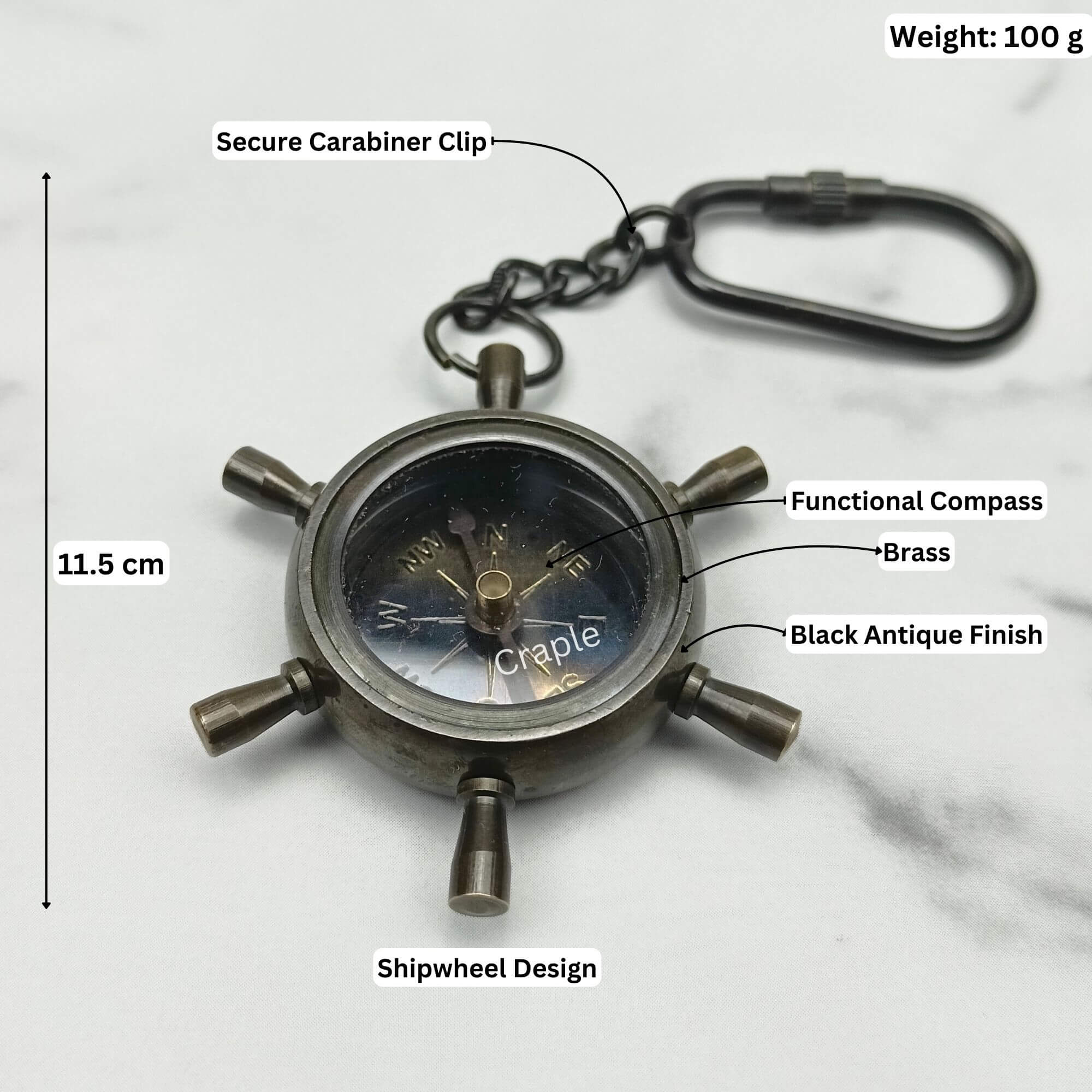 Navigate your day with vintage flair! This unique keychain features a working compass set in a classic shipwheel design, all crafted from brass with a striking black antique finish. A cool, functional accessory.