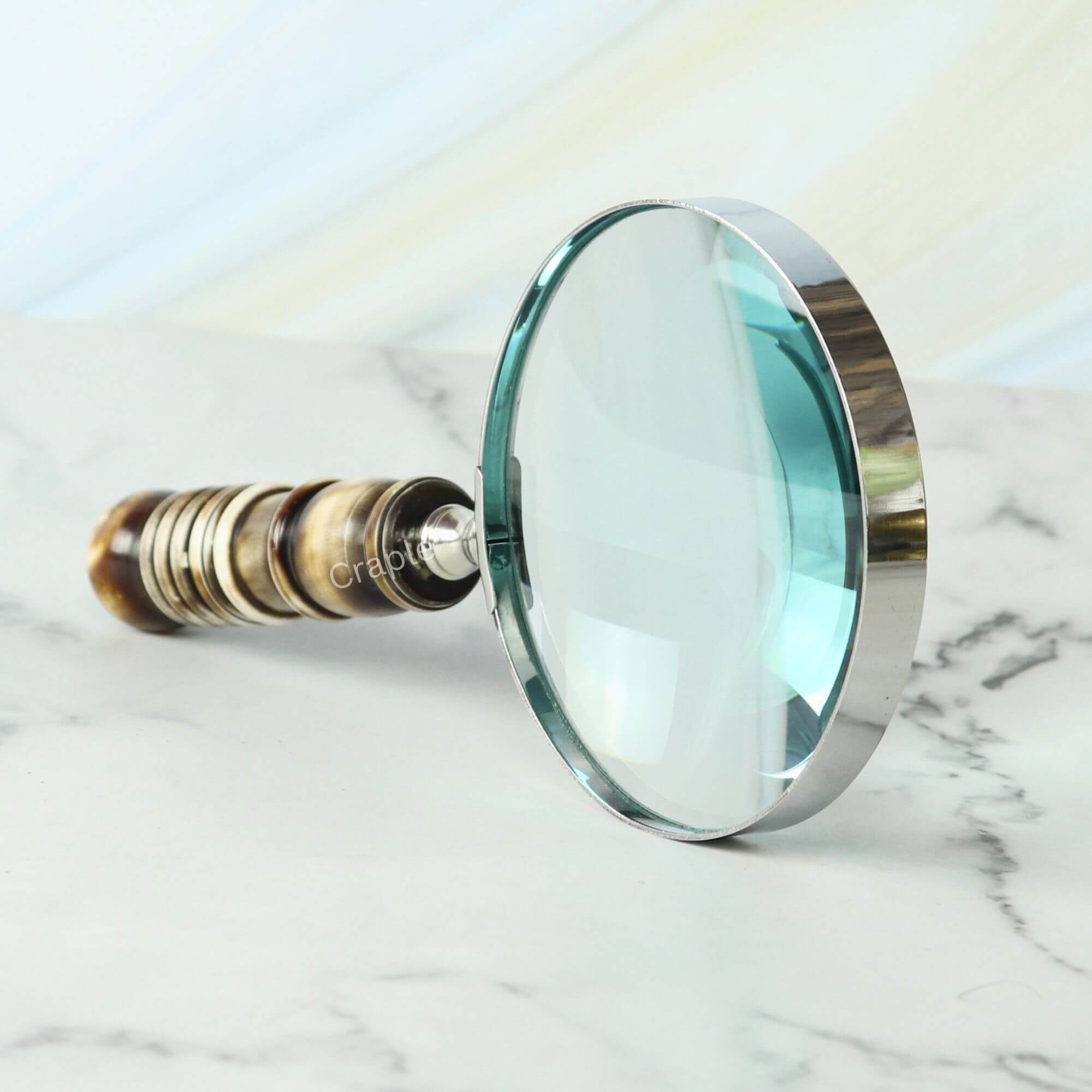 This magnifier features a bright nickel finish on a solid brass frame and a unique turned handle that mimics rich wood tones, it’s a pleasure to hold and behold.