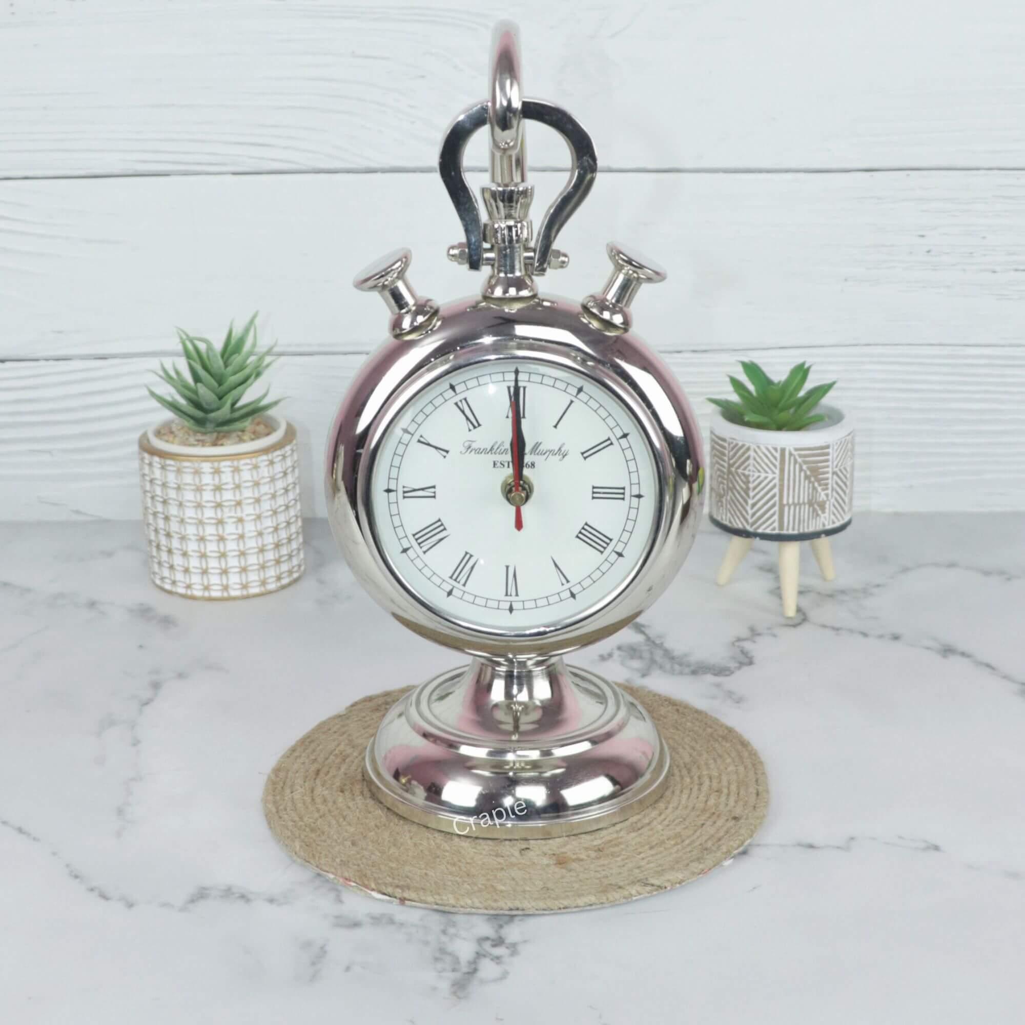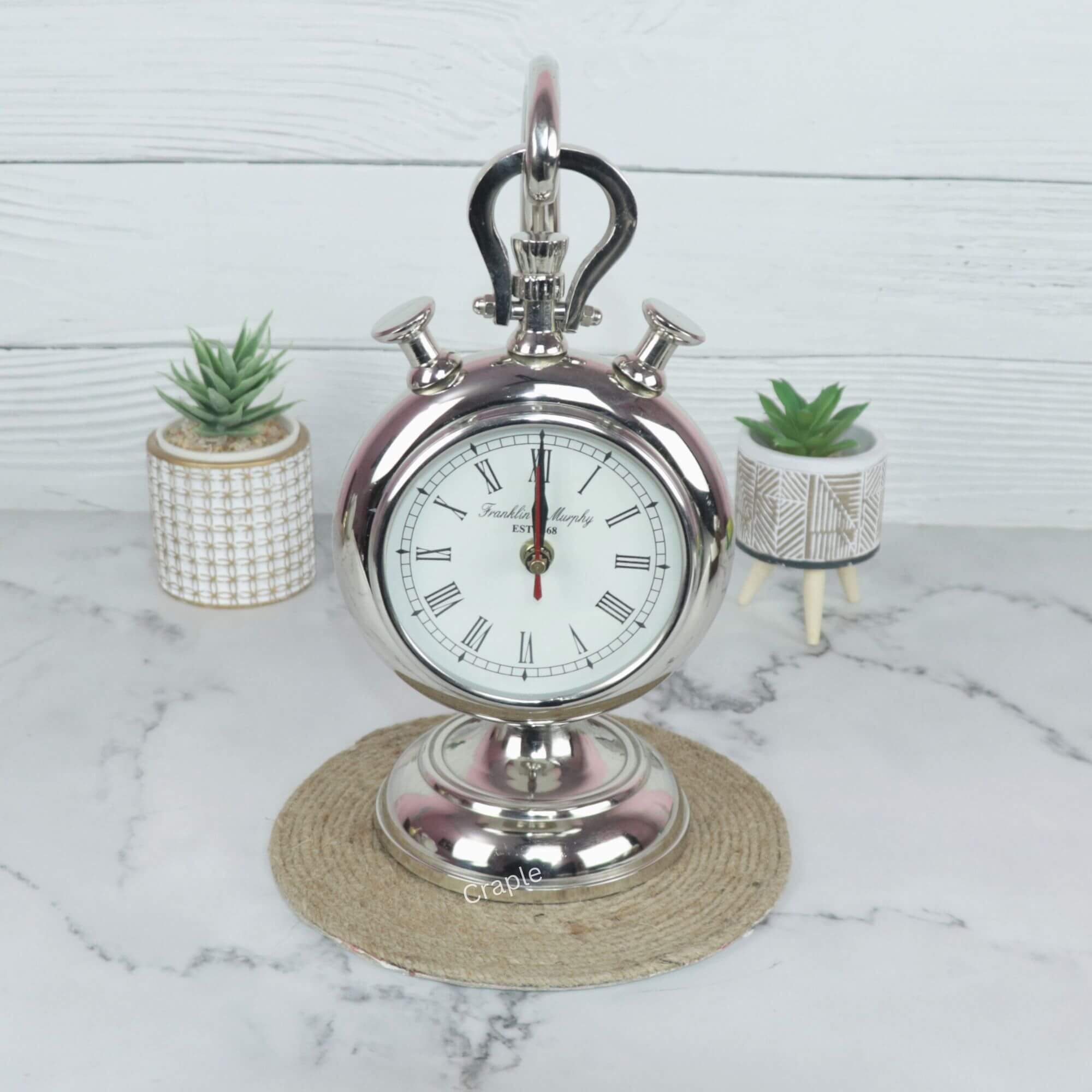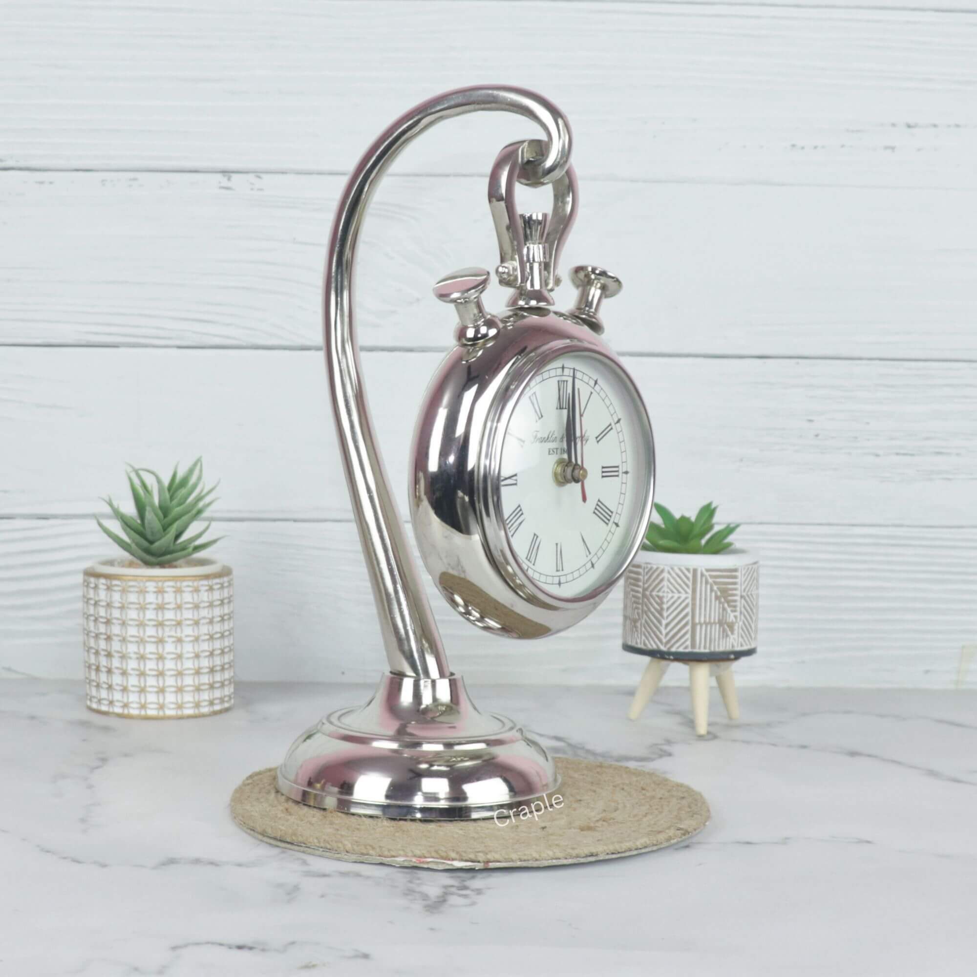 Hanging Stopwatch Style Nickel Aluminium Desk Clock | Handcrafted, Roman Numerals | Franklin & Murphy Inspired Decor