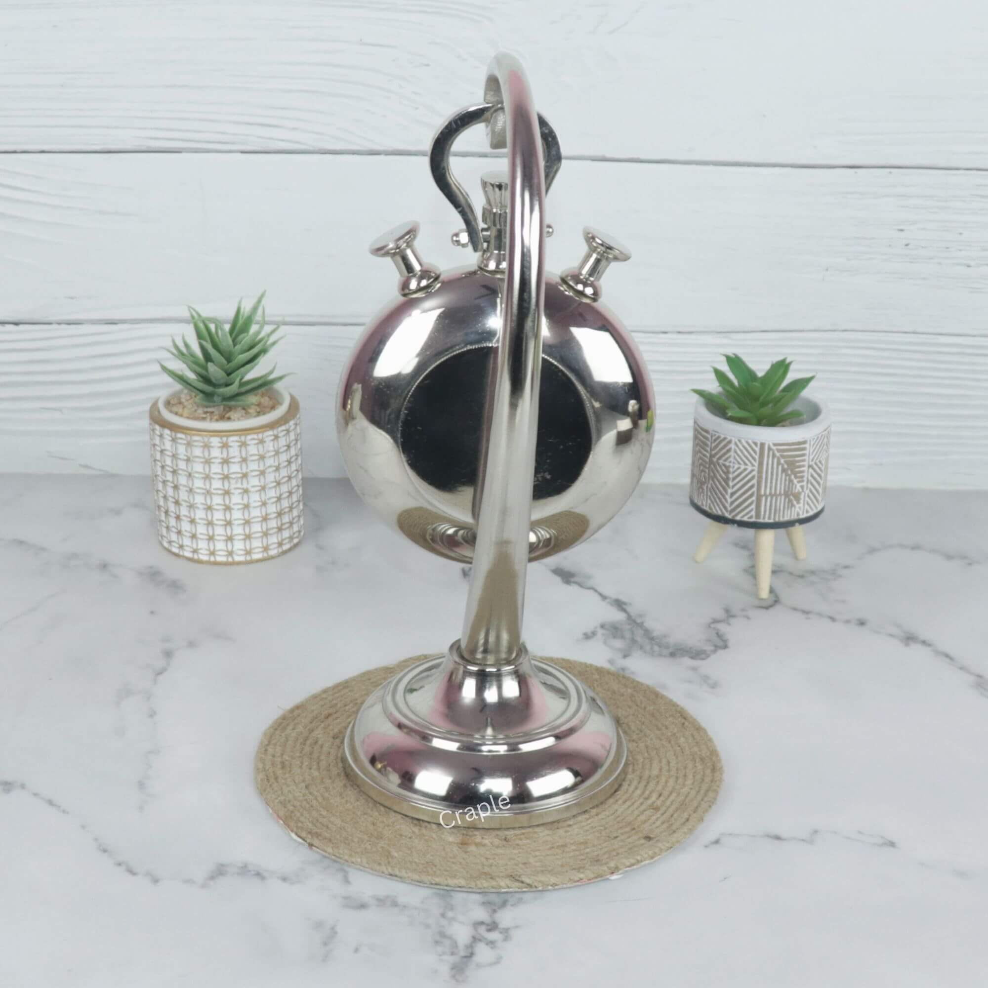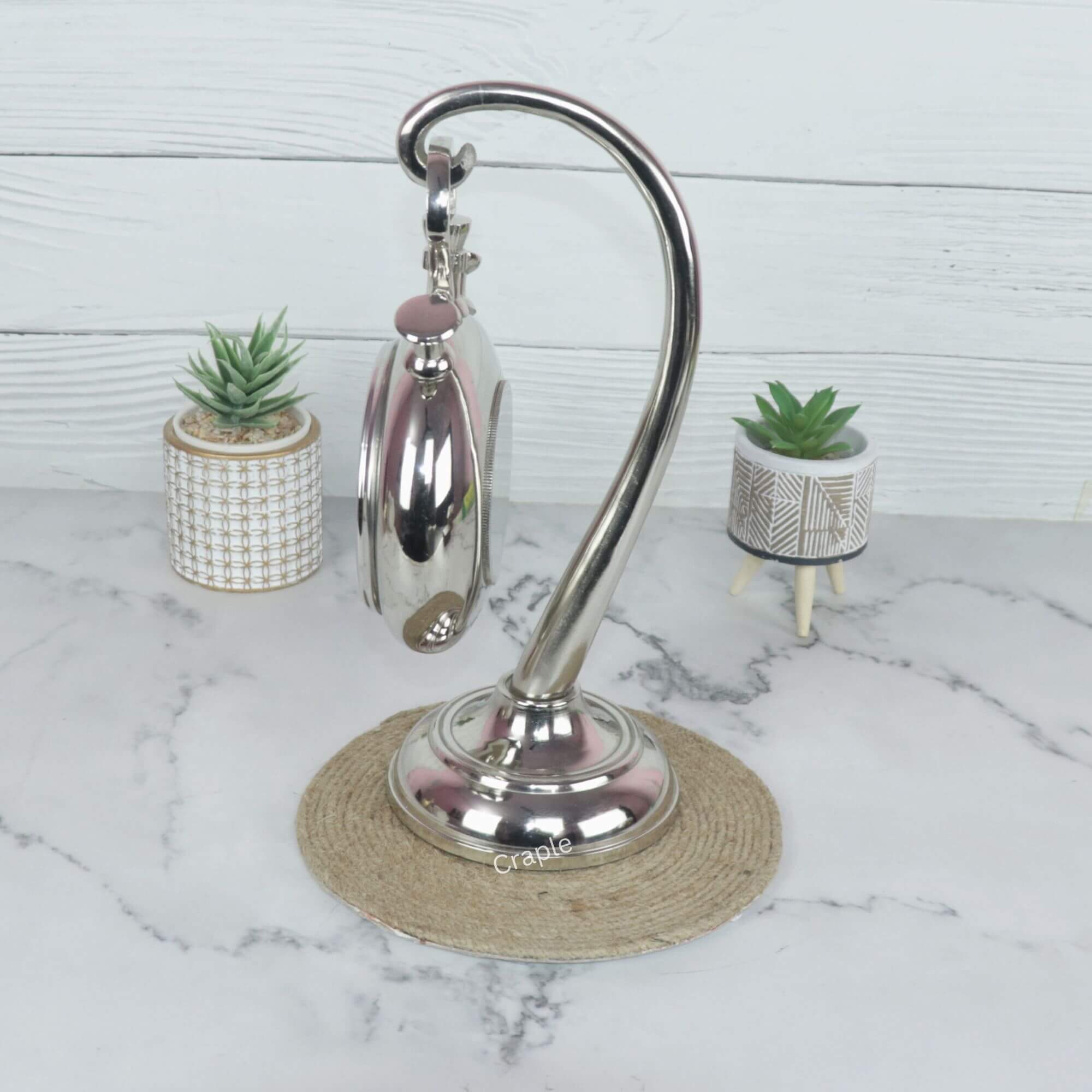 Capture attention with this elegantly designed desk clock, crafted to resemble a classic stopwatch suspended from a graceful stand. Made from handcrafted aluminium with a polished nickel finish, it’s a sophisticated blend of vintage inspiration and modern style.