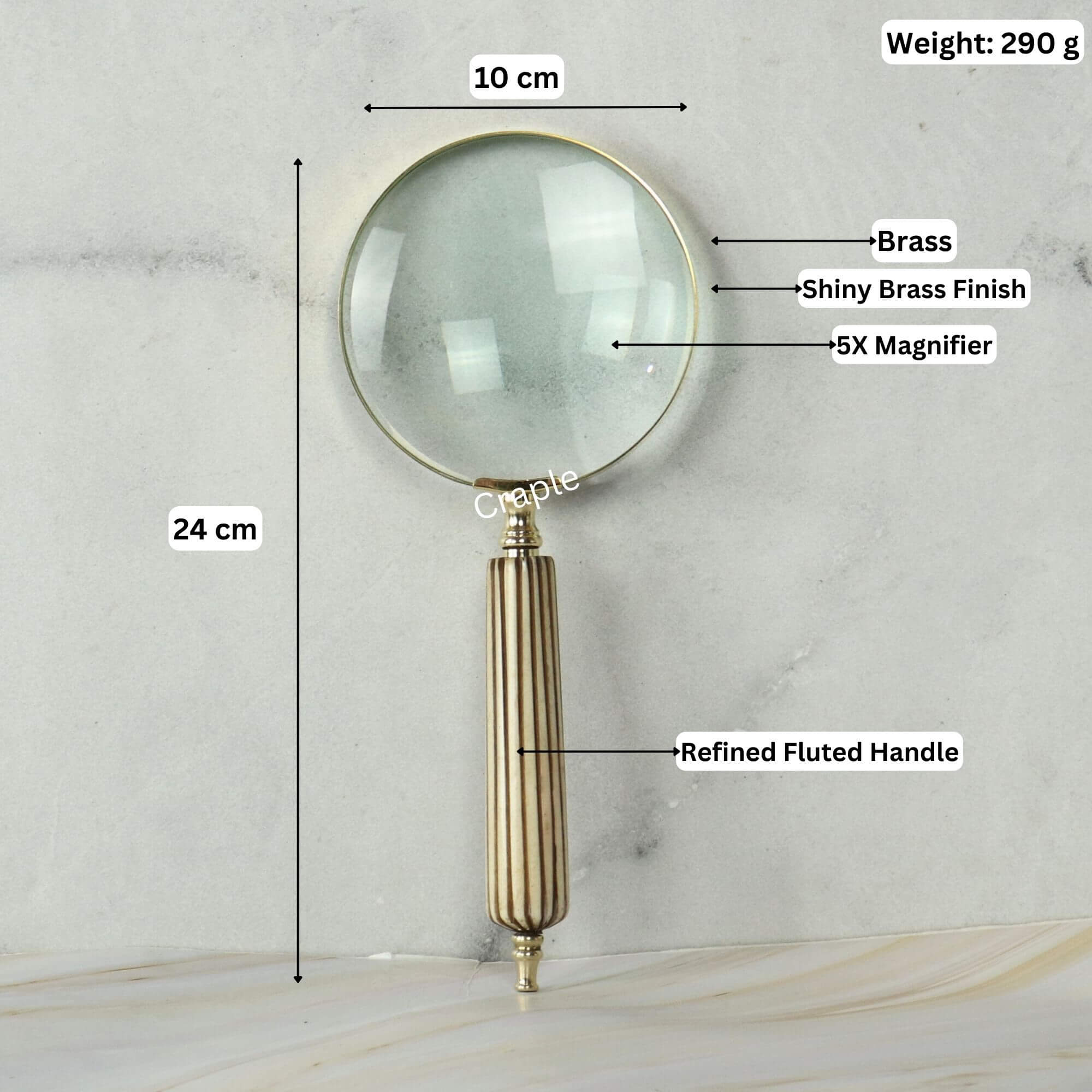 Experience a refined blend of classic design and subtle texture. This handheld magnifier features a lustrous brass frame holding a clear lens, paired with an elegantly fluted handle for a comfortable and stylish grip.