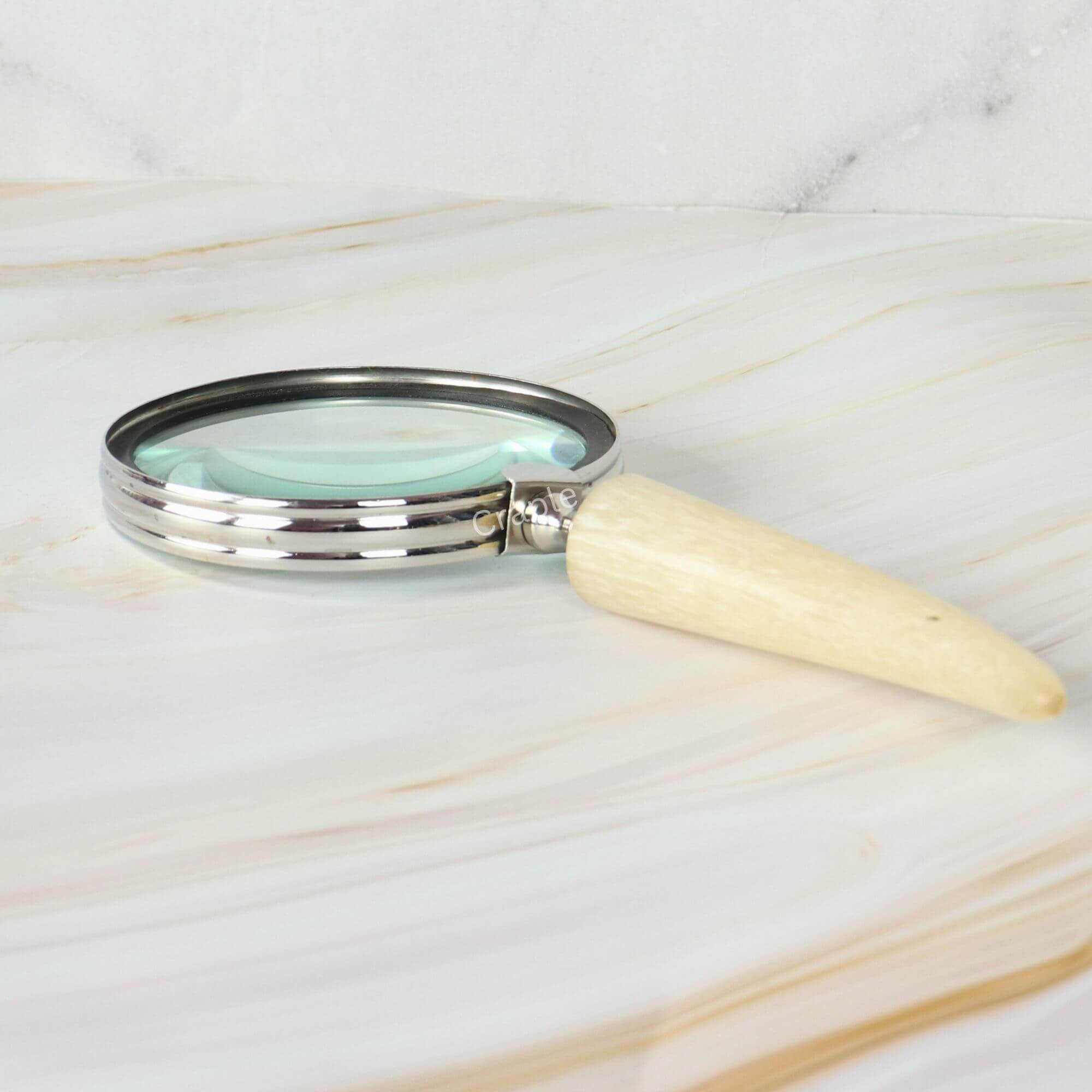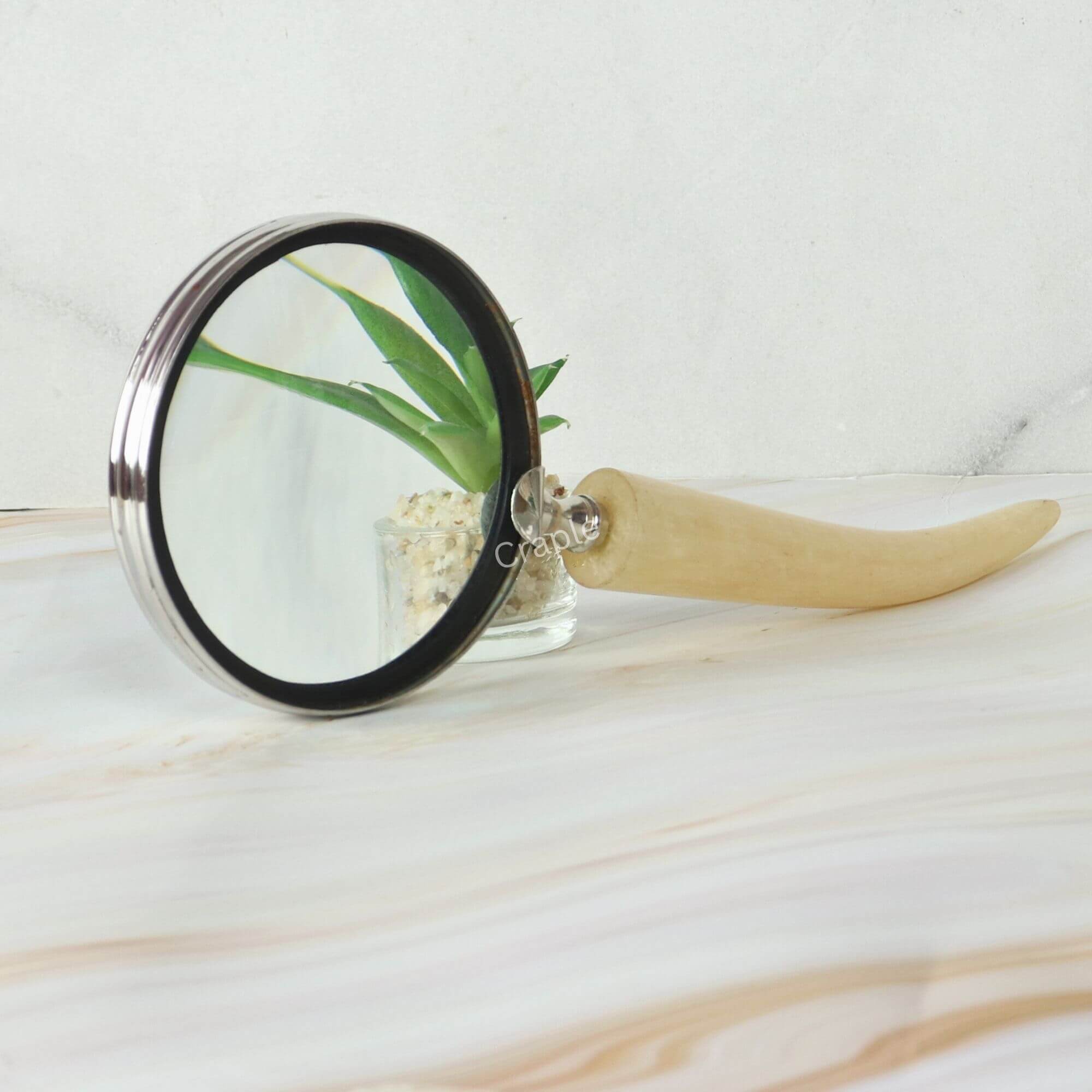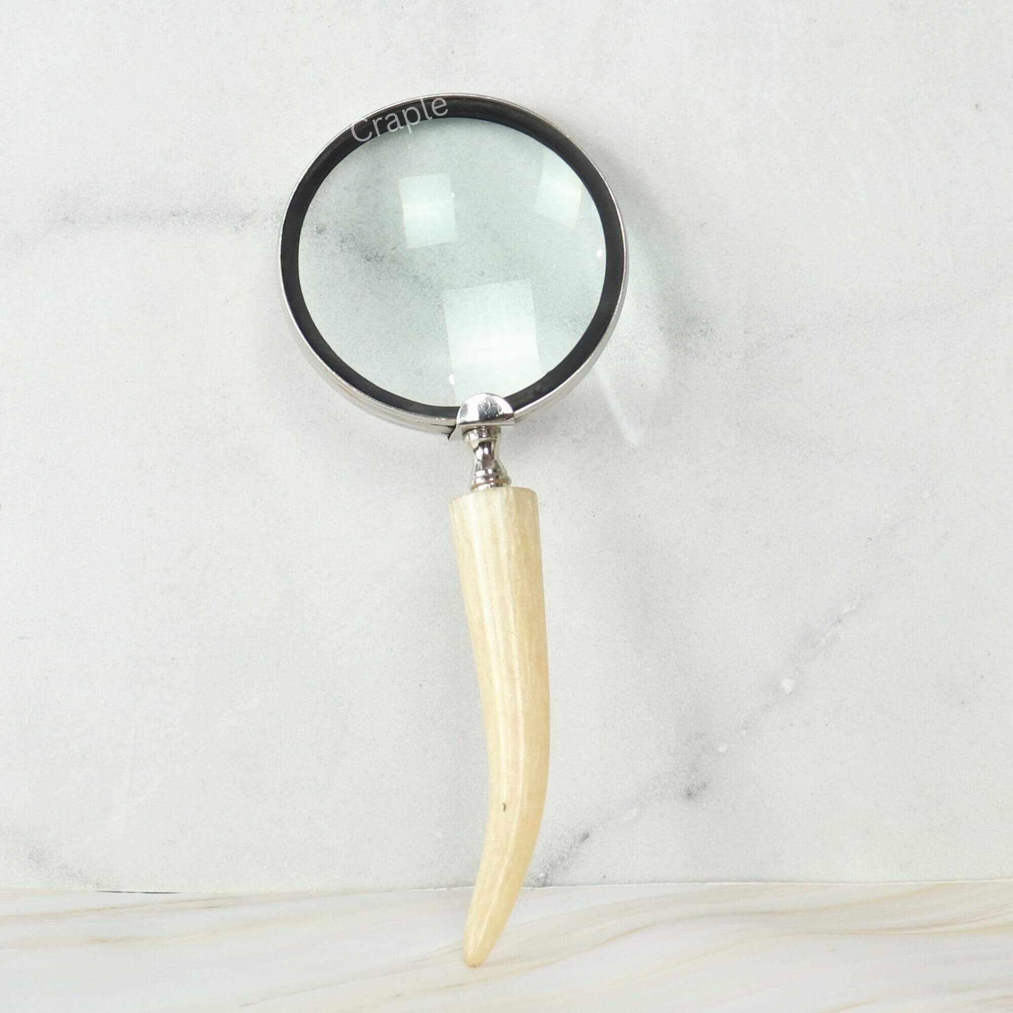 This magnifying glass features a sleek nickel-finished brass frame paired with a unique horn-style resin handle, offering clear viewing and distinctive character.