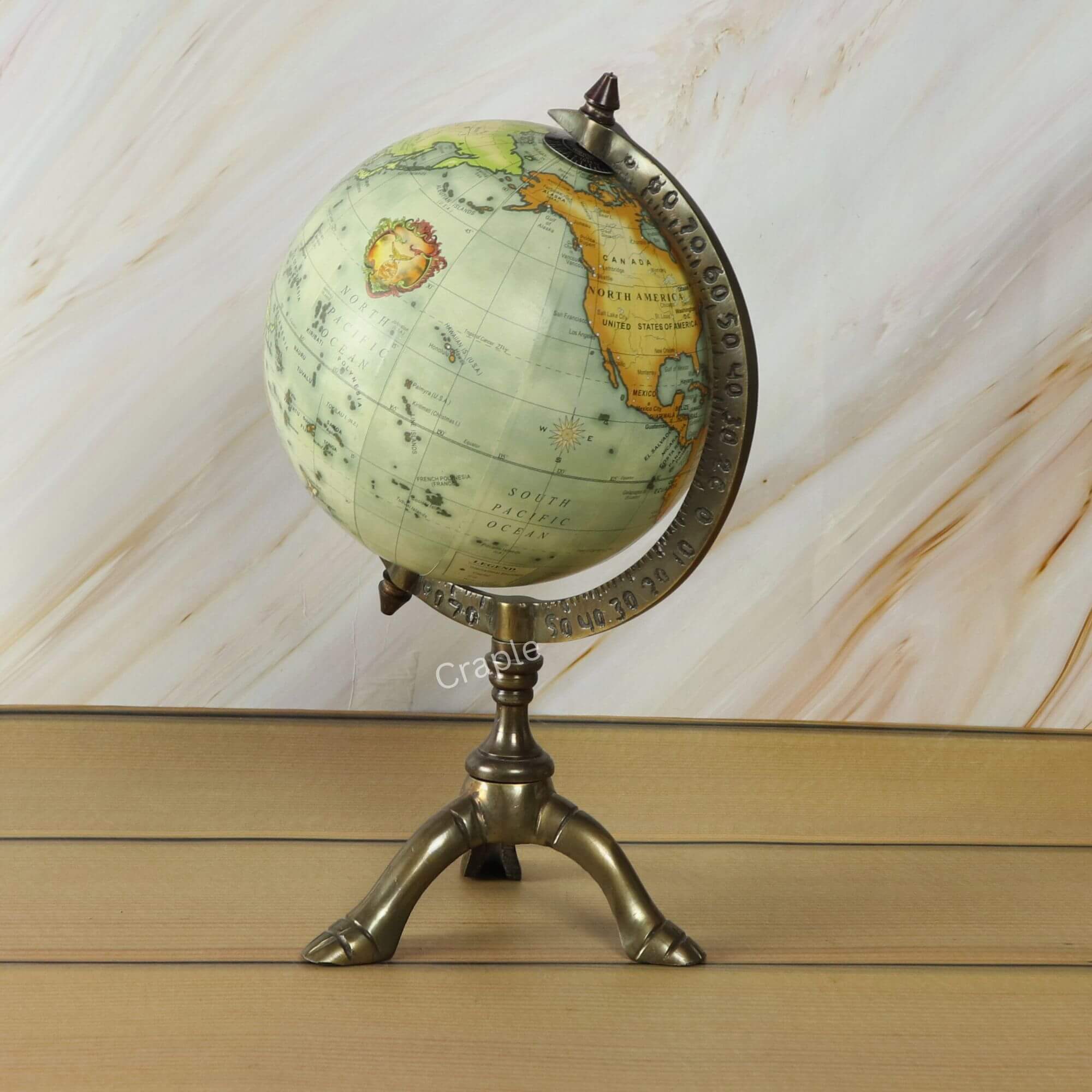 Antique Brass Tripod World Globe | Engraved Arm, Detailed Map | Vintage Desk Decor & Gift